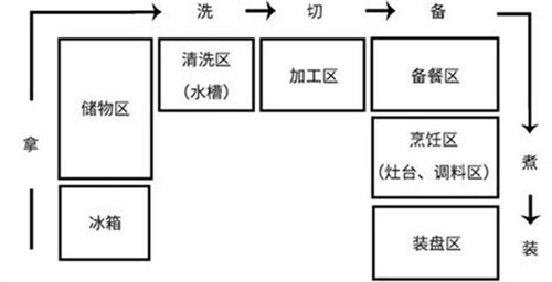 8.廚房動(dòng)線設(shè)計(jì)要合理。動(dòng)線一般遵循烹飪的基本流程設(shè)計(jì):儲(chǔ)物>洗菜>切菜>炒菜>裝盤。