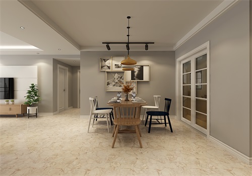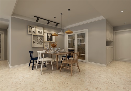 ? 原木色長桌加上各色的椅凳設(shè)計(jì),灰色的墻面上用一些組合掛畫利用射燈增加光線,餐桌上方則用一排吊燈來增加局部光線氛圍。