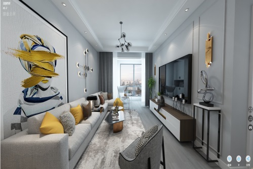 ? 沙發(fā)后面的墻面上用一副大的充滿設計感和時尚范的掛畫點綴,旁邊也是一個精致的墻上飾品設計,陽臺上精致的窗簾和沙發(fā)采用同色系組合。