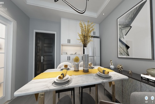 ? 大理石帶紋路的白色餐桌,淺灰色的椅凳設計旁邊有一個長方形的邊柜,矮邊柜下邊是收納上邊是置物臺可以放置很多小物件、