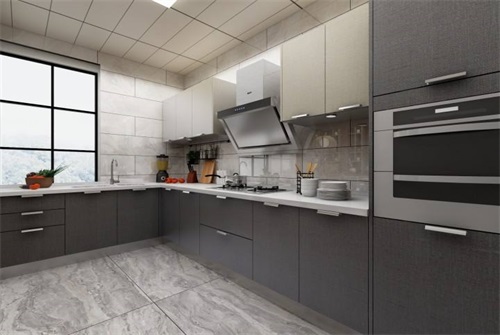 ? L形的廚房設計上,灰色的櫥柜設計加上吊柜組合滿足廚房的一個收納需求設計,電器做的都是柜體內嵌式,這樣設計方便又好看,廚房正中間的窗戶設計給廚房增加了光線感和通風設計。