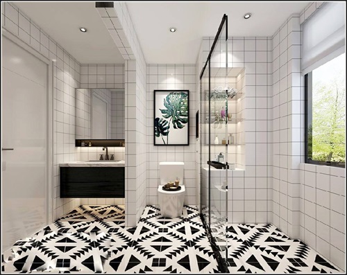 ? 經(jīng)典小白磚加上黑白色的花色地磚,時尚又精致,洗漱臺、廁所、淋浴間功能區(qū)分開設(shè)計,讓使用更加便捷,玻璃的隔窗不會影響光線和通風(fēng),洗漱臺做臺下柜和鏡面柜方便收納,淋浴間做壁龕設(shè)計鏡面隔板收納。