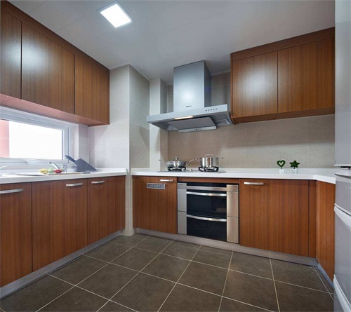 ? 木質的櫥柜加上白色的廚臺設計,淺灰色的地磚耐臟一流,原木色的櫥柜加上吊柜組合滿足收納的需求,U形的廚房設計電器都做了柜體內嵌式,這樣使得整個廚房看起來干凈又整潔。