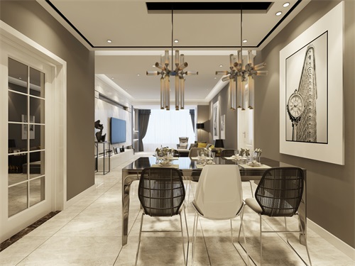 ? 長方形的餐桌可同時(shí)滿足多人用餐,黑白色的餐椅搭配工藝式餐桌設(shè)計(jì),灰色的墻面上裝飾一幅壁畫設(shè)計(jì),餐廳頂上裝飾兩盞精致的吊燈裝飾給餐廳增加一定溫暖的光線使用餐氛圍更加舒適。