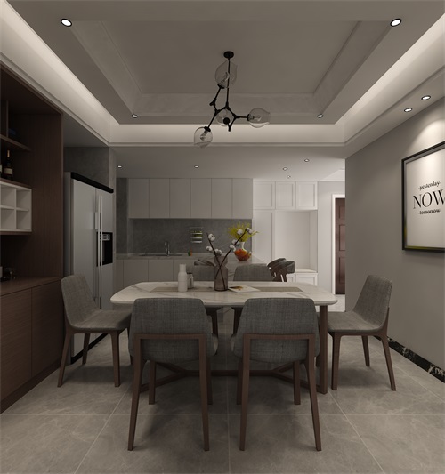 白色的餐桌加上淺灰色的椅凳設(shè)計(jì),簡(jiǎn)潔范中帶點(diǎn)小清新味道,椅凳的色系與墻面形成同色調(diào)看起來(lái)別有一番味道,旁邊靠墻打造的一排置物柜設(shè)計(jì),以收納和展示柜為一體化,增大儲(chǔ)物空間,簡(jiǎn)約的分子吊燈適當(dāng)給出溫馨的光線(xiàn)讓用餐氛圍更加舒適,墻面上少量點(diǎn)綴簡(jiǎn)單的壁畫(huà)設(shè)計(jì)。