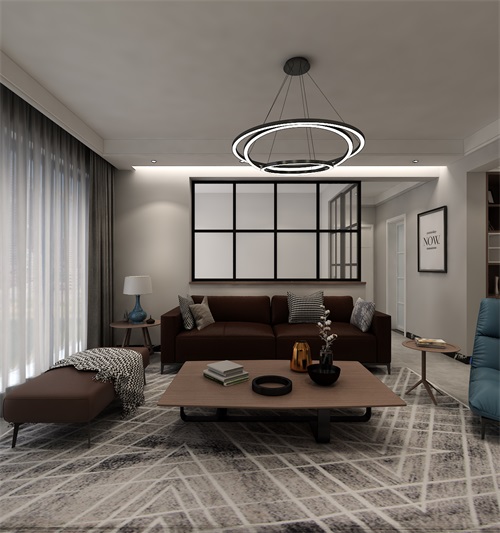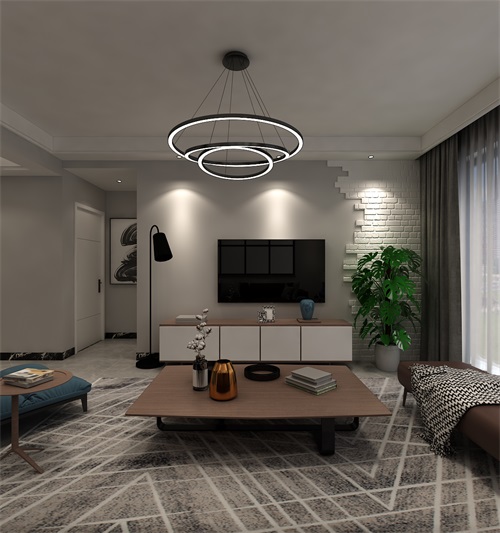 淺色的地面在客廳中間放了一張多邊形雜色地毯,倒三角的設(shè)計(jì)更顯精致特別,薄形的客廳桌放置一些日常的花瓶增添室內(nèi)的溫馨感,單人椅凳旁設(shè)計(jì)可移動(dòng)小邊桌置物頂上搭配圓環(huán)形的吊燈設(shè)計(jì)精致大氣。