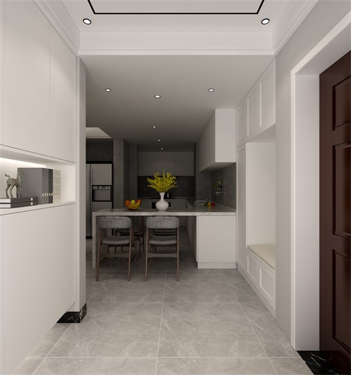 半開(kāi)放式餐廳設(shè)計(jì),白色的上下柜墻面使用淺灰色,電器內(nèi)嵌顯得臺(tái)面更干凈舒適,櫥柜加吊柜的設(shè)計(jì)增加空間的收納量,這樣女主人有再多的東西都不怕沒(méi)地放了。