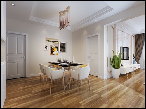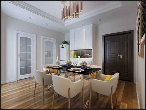 黑色的餐桌搭配白色的椅凳,利用拐角處的空隙設(shè)計(jì)功能區(qū),在墻面上裝飾一些組合式掛畫頂上安裝精致的吊燈給餐廳增加溫馨的光線氛圍感。