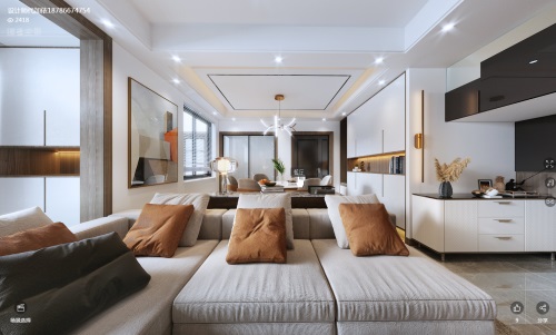 客廳是奶茶色的沙發(fā)和橘色的椅凳,在色彩上就是一個(gè)不小的色彩沖擊感,頂部安裝吸頂燈和一個(gè)簡(jiǎn)約的小吊燈裝飾照明。