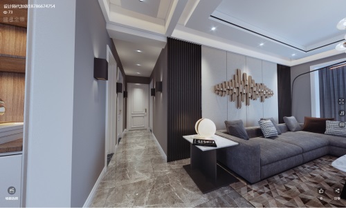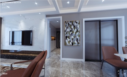 客廳和餐廳的距離不是很大,從走廊看去玄關部分,玄關沿墻打造了一面柜體柜體中間和底部留空設計設計燈帶。