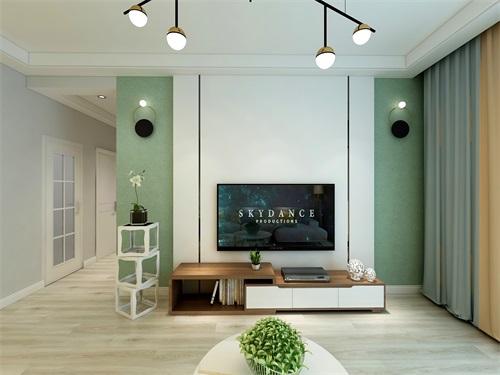 白色的背景墻兩邊是淡綠色的裝飾底面,兩邊裝飾一款精致的壁燈更顯別致感,木色的電視柜在造型上還是顏色上都舒適自然。