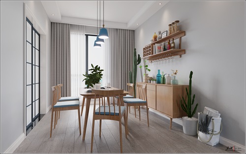 原木色的餐廳設(shè)計(jì)舒適,白色的墻面淺灰色的窗簾和小巧簡約的木質(zhì)餐桌椅凳,搭配同色的餐邊柜和墻面收納架,別提多溫馨了。