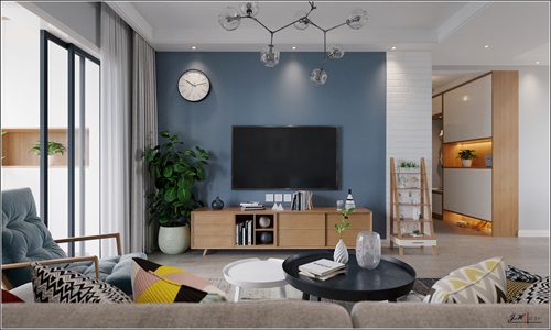 藍(lán)色的客廳背景墻面,邊框做一點(diǎn)白色的文化墻再加上原木色的電視柜,顯得層次分明色彩柔和。