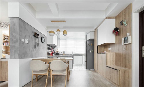 遵義裝修公司小編給介紹的這是一套89平米北歐風(fēng)兩居,入戶(hù)就沿墻打造一面收納柜木柜按照需求做了高低不同高度的設(shè)計(jì),讓回家就能放松自己??旄?span style="color:#000000;">