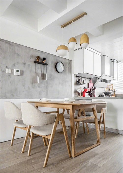 沿著半開(kāi)放式廚房木質(zhì)餐桌和同款椅凳設(shè)計(jì),簡(jiǎn)約的家具給人不簡(jiǎn)單的生活治愈感,沿墻面上水泥背景上簡(jiǎn)約的裝飾物干凈素雅。