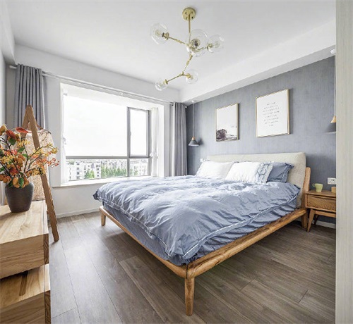 主臥背景墻以淺灰色為主加上深色的地板,飄窗給臥室充足的光線(xiàn)和通風(fēng)條件,加上淡藍(lán)色的床品給人舒適感。