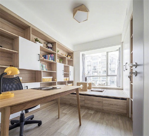 次臥是榻榻米和書(shū)柜一體式,沿著墻打造整面的收納展示柜充分利用空間收納,一張簡(jiǎn)易書(shū)桌和椅凳就是書(shū)房了,家里有客人還可以充當(dāng)臨時(shí)客房。