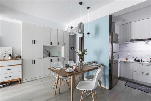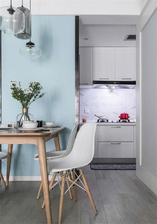在定制墻柜的另外一邊就是餐廳,藍色的背景墻木色的桌椅大方溫暖,在玻璃吊燈的映襯下日常三餐也能吃出美味佳肴。