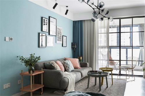 雙人座的灰色沙發(fā)后面是湖藍色的背景墻,墻面利用組合式掛畫點綴形成別樣的風景,雙色拼接式客廳桌可移動性和實用性都很強。