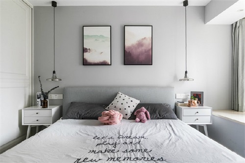 主臥室的背景墻面以淺灰色為主配上兩幅掛畫和吊燈就非常的好看了,白色的床頭柜精致小巧,沿墻打造一整面的收納柜滿足收納空間不足問題。