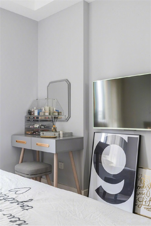 床尾角落里是一張小梳妝臺,灰藍色的色調十分耐臟,搭配同款鏡面十分精致,旁邊是一臺掛壁式的電視,日常打游戲追劇都很不錯。