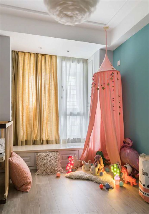 兒童房相對比色彩比較多一些,藍色的背景墻木質地板奠定了整個溫暖的氛圍感,一個粉色的娛樂角就是孩子的小天堂,由于孩子現(xiàn)在還小所以沒有設計床只是放了一個嬰兒床。