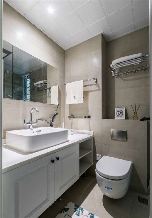 衛(wèi)生間的空間有限但是也做了一個隔斷式的干濕分離,在淋浴區(qū)設計玻璃門隔斷讓干區(qū)不受影響。