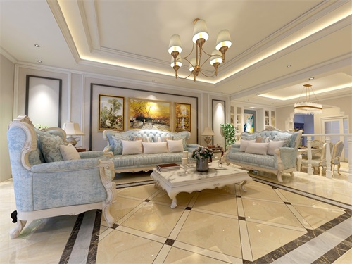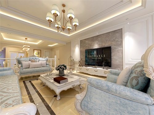 藍(lán)色的沙發(fā)給人藍(lán)藍(lán)的夢(mèng)幻感,象牙白色的客廳桌連四周都是精致的花紋圖案,頂面打造的是利用石膏做層次的線條設(shè)計(jì)。