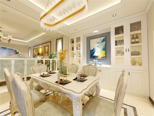 精致的餐桌雕繪讓我們看到了簡(jiǎn)歐風(fēng)格的華麗和大氣以及注重每一個(gè)細(xì)節(jié)的刻畫(huà),象牙白的餐桌搭配同款椅凳設(shè)計(jì)。