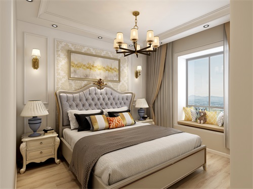 主臥以白色為主背景墻面裝飾淺色系掛畫,飄窗設(shè)計成休閑坐臺,奶茶色的窗簾和床品形成色系一致。