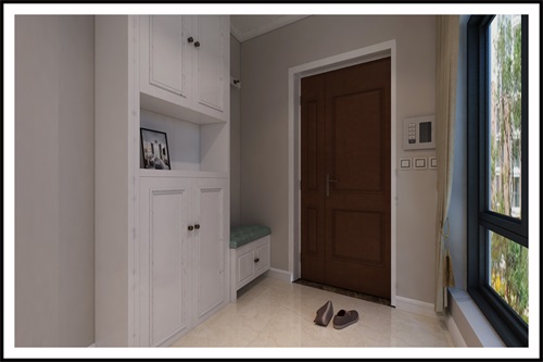 入戶玄關(guān)做了柜凳和掛鉤方便回家換鞋和外套,白色的柜子在中間留空設(shè)計放置日常的鑰匙等小物件。