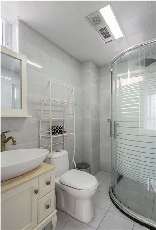 衛(wèi)生間做了干濕分離,用玻璃隔斷淋浴區(qū),在馬桶上方還做了一個置物架方便放置日常的一些毛巾和雜物。