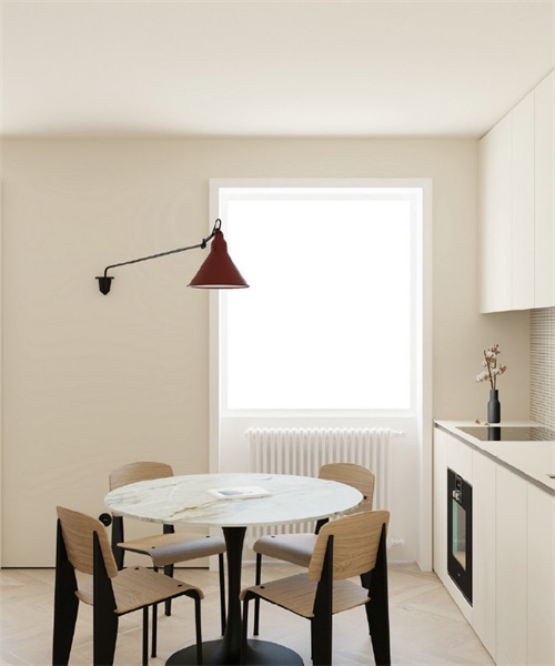 圓形的餐桌加上原木色的椅凳和黑色的支柱,讓空間的流動線不拘束一盞從墻上延伸的紅色吊燈給餐廳吸晴的一面。