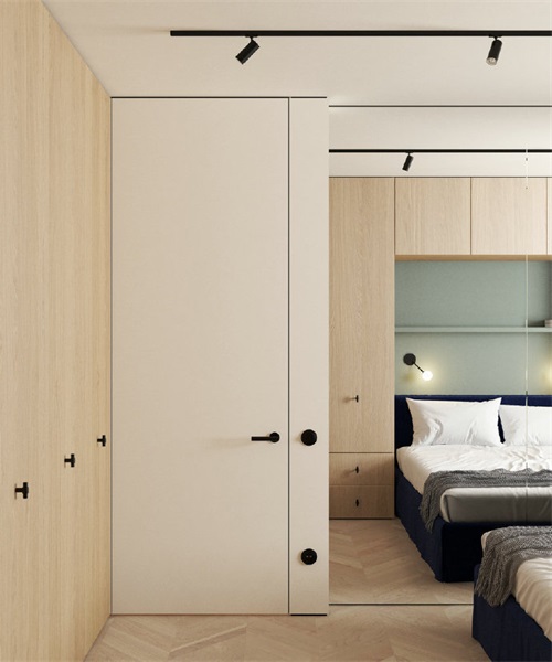 沿著窗邊是內(nèi)嵌式的墻柜收納,床尾則是打造整面落地鏡增加視覺上的空間延展,入戶的門做成大方簡約的半隱藏式。