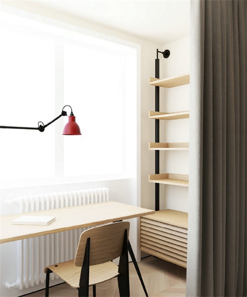 窗戶角落設計辦公小桌,臨窗放置旁邊一個豎排的置物架放文件或書籍類,同樣一盞可伸縮活動的長壁燈讓夜晚的工作更具溫馨。