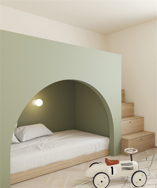 兒童房的設計主打休閑娛樂的空間居多,在床的四周打造圓弧形的拱門然后上面是休閑娛樂區(qū),下面是休息的地方,淡綠色讓人看著非常的養(yǎng)眼,其余不做任何家具擺設,盡量給孩子都足空間游戲。
