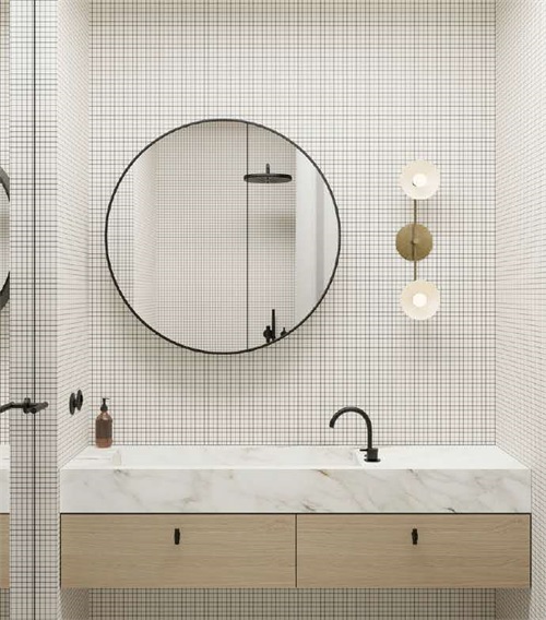 干濕分離的衛(wèi)生間,一體式的洗漱臺非常別致底部留空不留死角,墻面采用的是小格子的強壯看起來清新又時尚。