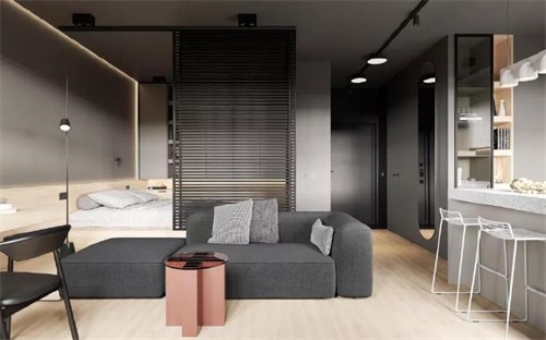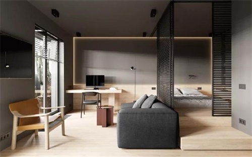 客廳和臥室用半透明可滑動(dòng)門(mén)作為功能區(qū)的隔斷,同時(shí)雖然空間不大但仍然還是做了娛樂(lè)休閑和工作區(qū)域。