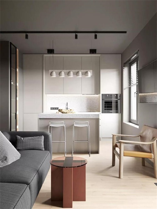 客廳用射燈替代吊燈不影響層高,廚房用吊燈和櫥柜燈帶照明,整體空間不大所以家具上都選用小巧可移動(dòng)性為主。