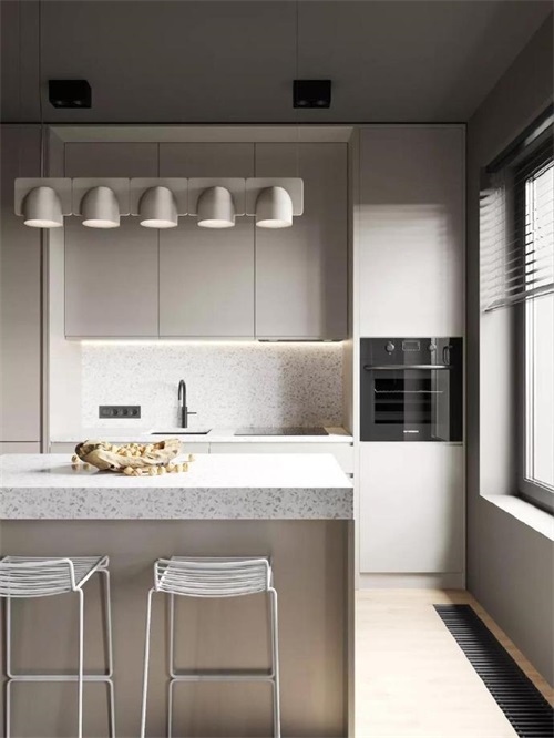 在沙發(fā)對(duì)面就是小小的廚房操作區(qū)了,以白色為主打破客臥的黑色系,顯得更明亮舒適,小島臺(tái)除了作為廚房操作區(qū)同時(shí)也兼用為用餐區(qū)。