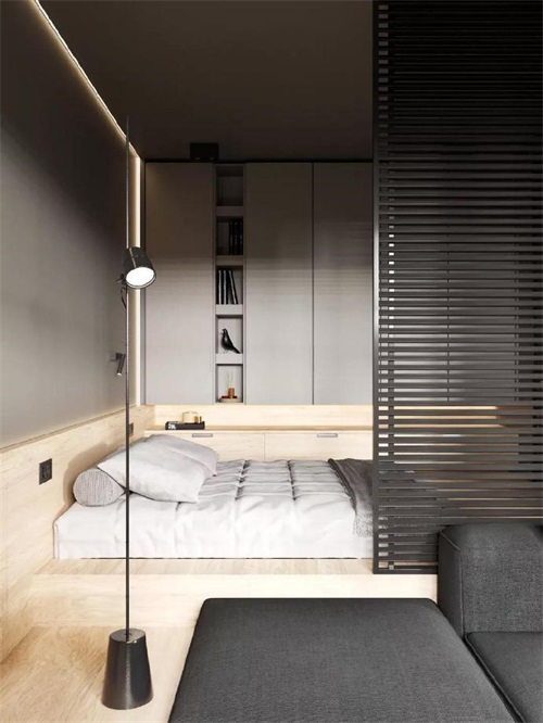 臥室上做的是高于地面的地臺(tái)設(shè)計(jì)上面做榻榻米床墊,沿墻做一面墻柜收納,臥室就完成了。