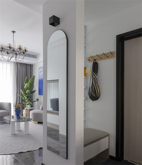 入戶打造一個(gè)小型置物換鞋凳,墻面做掛鉤收納鞋凳旁邊的墻面鑲嵌一面鏡子出門前檢查儀容儀表,更重要的是避免了隱私。
