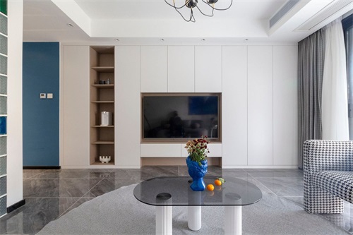 客廳背景墻面打造超強(qiáng)收納,白色的隱形墻柜中間留置出電視機(jī)的空間,邊上留出一個(gè)豎排的展示柜放展示品。