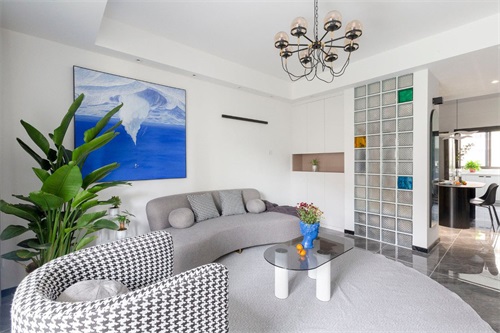 客廳一張別致的弧形沙發(fā),靠著玄關(guān)的背面還做了一排收納柜增加儲(chǔ)物功能,白色的墻面上一副藍(lán)色的風(fēng)景圖別有一番景象。