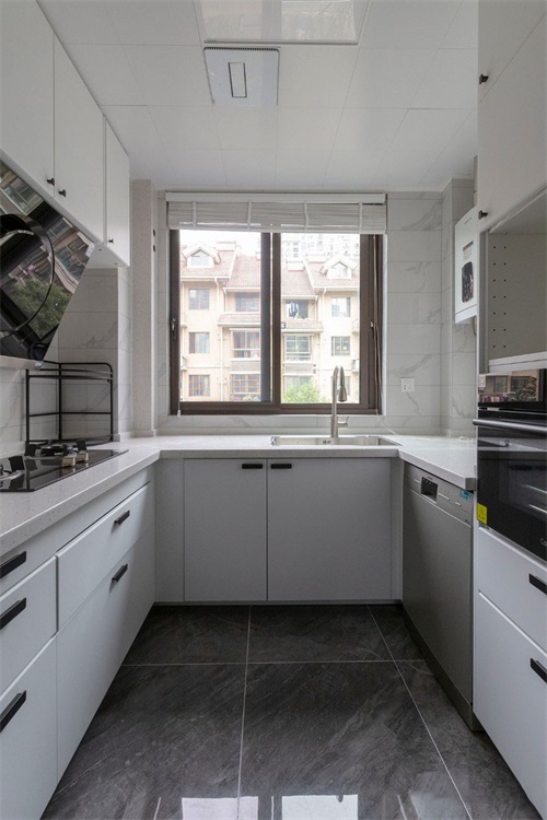 U形的廚房廚臺(tái)設(shè)計(jì),白色的櫥柜做上下兩層處理柜增加儲(chǔ)物空間,白色的櫥柜搭配灰黑色的地磚簡(jiǎn)約時(shí)尚。