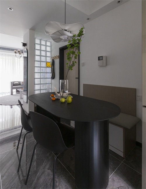 餐廳在入戶左邊一張小型卡座,黑色的客廳桌和同款椅凳搭配時(shí)尚簡(jiǎn)約,最別致的要數(shù)這個(gè)荷葉形的吊燈,可以說是非常別致款的了。
