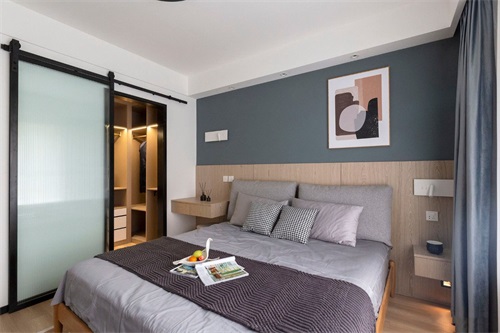主臥室灰藍(lán)色背景和原木色的背景墻板,藕紫色的床品簡(jiǎn)約又實(shí)用,主臥還有一個(gè)小型的入戶式衣帽間,更滿足女主人的置物需求。