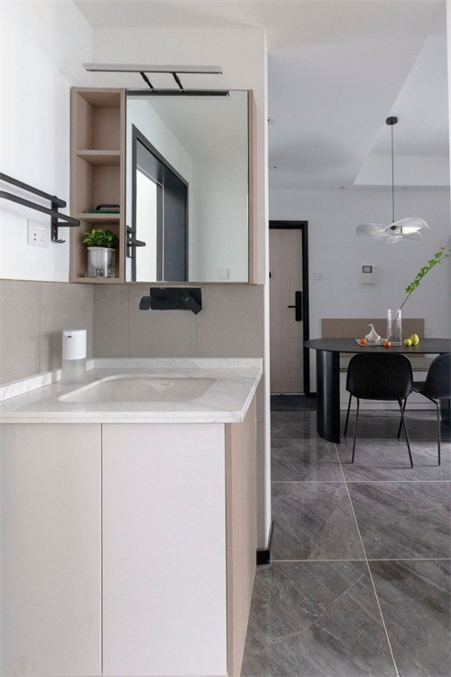 洗漱柜外放,這樣做干濕分離的隔斷讓衛(wèi)生間的電器壽命更長久,鏡柜和洗漱柜都有收納空間滿足小戶型的置物需求,淋浴間還做了玻璃門隔斷減少水漬。