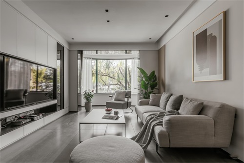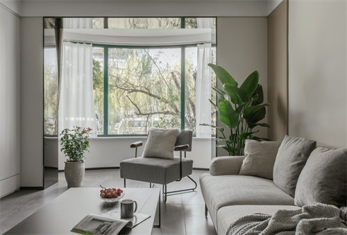 淺色系的沙發(fā)和同款椅凳設(shè)計,客廳的陽臺是一個弧形設(shè)計,設(shè)計師根據(jù)框架打造玻璃窗給室內(nèi)的光線提供充足溫暖陽光。