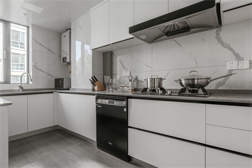 廚房以白色的墻磚搭配白色的櫥柜看起來更干凈整潔,上柜加下柜的組合增加廚房的置物空間,流暢的動線操作讓做飯更愉快。